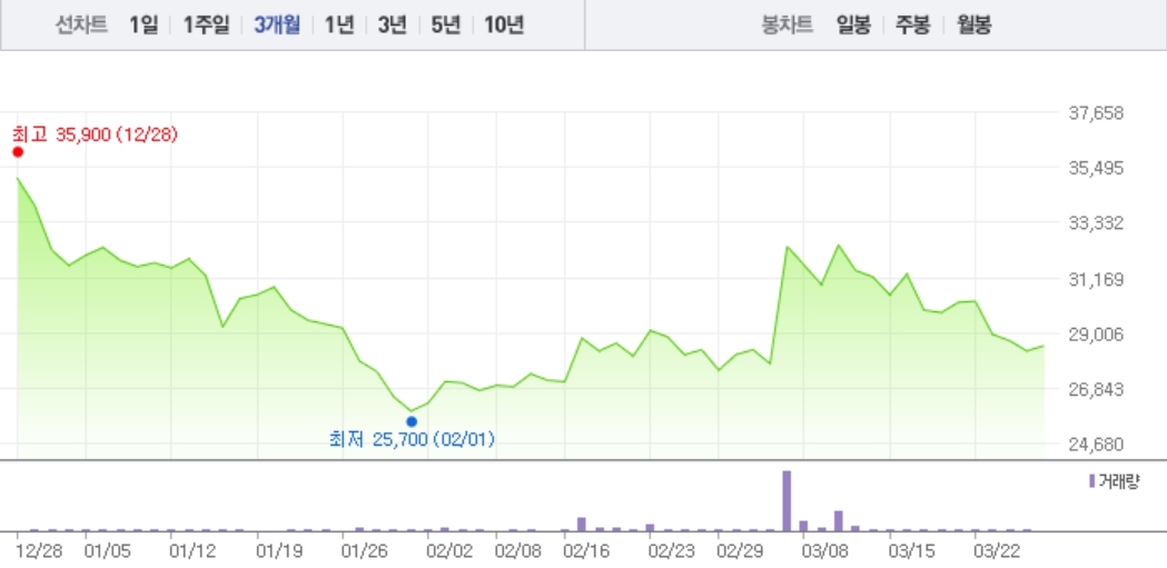미래컴퍼니 주가는 현재 28,500원이다. 3개월간의 주식 차트를 보면 작년 12월 최고가를 기록한 이후 계속 우하향으로 내려갔으나 올해 2월 이후 다시 상승하는 모습을 볼 수 있다.